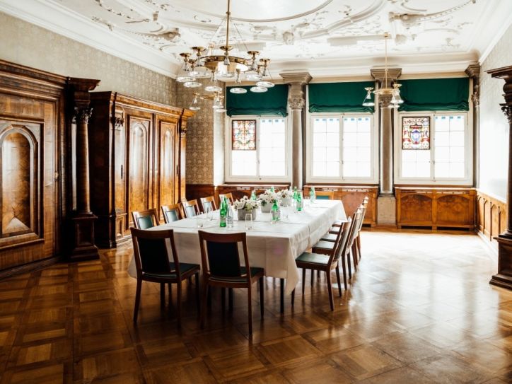 Une des plus anciennes maisons de corporations, acquise par les forgerons en 1412, puis aménagée et agrandie au fil des ans, la Zunfthaus zur Schmiden propose aujourd’hui 3 salles, dont le joyau, la « Zunftsaal », magnifiquement décorée qui peut accueillir jusqu’à 200 personnes pour un séminaire en théâtre ou 130 personnes pour un banquet.