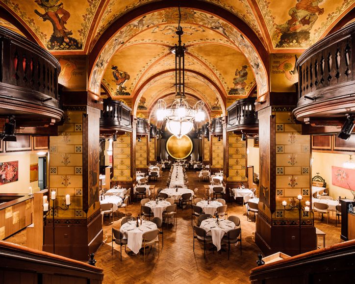 Ce lieu spectaculaire et emblématique de la ville a d’abord été édifié comme grenier à grain en 1711, puis transformé en restaurant et décoré dans ce but. C’est pourquoi les voûtes de cette cave, d’un immense volume, sont ornées de fines fresques Art Nouveau, de même que l’étage du bar. D’un seul tenant, le restaurant accueille jusqu’à 220 couverts. Avec le bar l’ensemble peut recevoir 450 personnes.