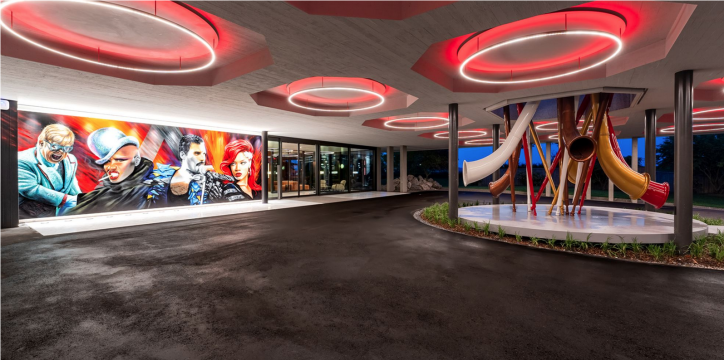 Et de trois ! Le dernier exemple à Zurich est un autre 5*, situé un peu à l’extérieur au vert, façon resort. L’établissement a fait appel à différents artistes locaux, comme le forgeron Franz Koster qui a réalisé une sculpture unique de 14 mètres de haut, réunissant 18 cors des Alpes ou encore le street-artist zurichois REDL avec sa fresque monumental à l’entrée de l’hôtel. Les 87 suites et 62 chambres de l’hôtel sont décorées par des oeuvres d’étudiants en beaux-arts du Zurich Centre de la Créativité Économique (ZCCE) et les différents restaurans proposent également des cadres “instagrammables”. Lieu de fête avant tout, l’hôtel a aussi plusieurs espaces dédiés aux événements professionnels avec une capacité maximal de 160 personnes en style théâtre.