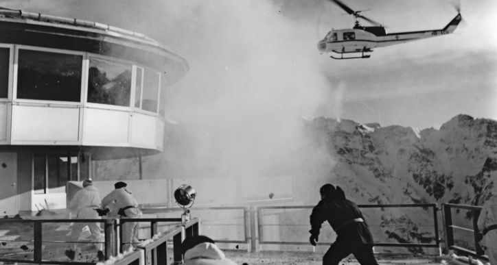 En effet, lors du tournage du film en 1968 le restaurant d’altitude était encore en construction. Le site a ainsi pu être utilisé pour la grande attaque avec les hélicoptères et les scènes de bataille, ajoutant une pointe de réalisme à un scénario plutôt fantastique.