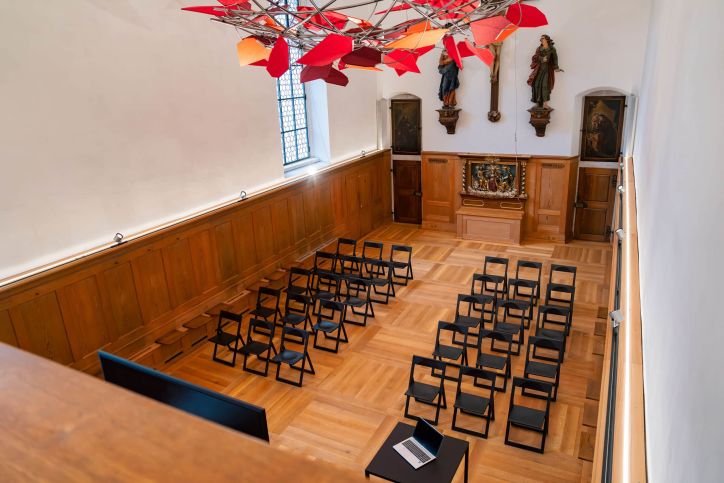 Le Culinarium Alpinum dispose donc de tout ce qu’un organisateur peut attendre… et plus encore. Huit salles de réunion et d’ateliers (jusqu’à 25 personnes), dont cette majestueuse salle du monastère (170 m², jusqu’à 150 personnes), des espaces intimistes comme l’ancien chœur ou l’atelier lumineux, la cave à vins pour les dégustations, et la cuisine pédagogique haut de gamme pour des team buildings ou des masterclasses. Côté hébergement, les chambres sobres et élégantes (anciennes cellules moniales transformées) invitent à la déconnexion et à la concentration. La restauration conjugue excellence gastronomique et ancrage territorial, avec des menus sur mesure, des plats à partager. Le tout dans un cadre calme, naturel et chargé de sens.