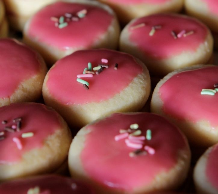 Cuire ensuite dans un four préchauffé à 180°C pendant 6-8 min. Les laisser tiédir. Garnir le côté plat d’un gâteau avec de la gelée de groseille ou de framboise, puis le couvrir avec un deuxième gâteau.