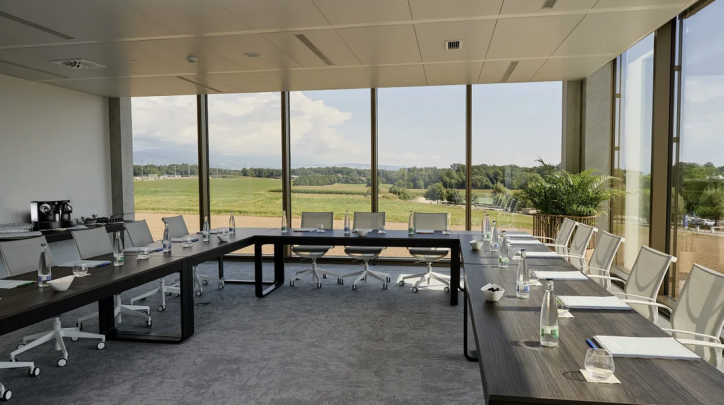 Les séminaires et événements professionnels sont un marché d’importance pour ce nouvel hôtel où plusieurs espaces sont prévus pour cela, et qui est situé attenant à un nouveau quartier d’affaires abritant quelques organisations internationales et des multinationales telles que la FIBA, GSK et Hublot. Quatre salles pour les petits groupes, de 25 à 55 m2, deux grandes, dont l’une est modulable en deux parties, ce qui permet de disposer de 7 salles au maximum et d’accueillir aussi bien de petits séminaires exclusifs que de grands événements. Le point commun de toutes et de bénéficier d’un éclairage naturel et la plupart ont vue sur le lac.